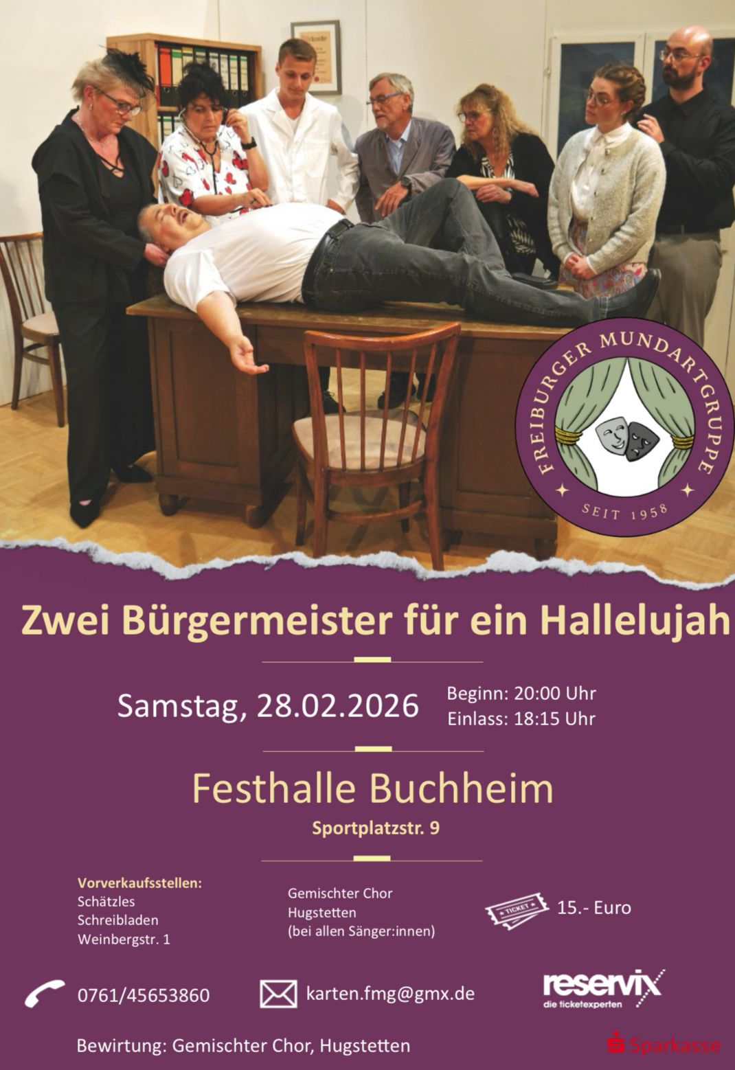 Die Freiburger Mundartgruppe e.V. ist am Samstag, 28.02.26 mit ihrem Theaterstück „Zwei Bürgermeister für ein Halleluja“ in der Festhalle Buchheim zu Gast.