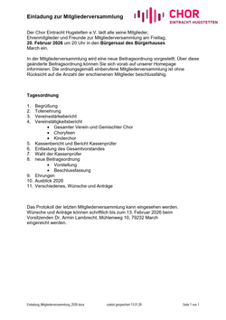 Der Gemischte Chor Eintracht Hugstetten e.V. lädt alle seine Mitglieder, Ehrenmitglieder und Freunde zur Mitgliederversammlung am Freitag,