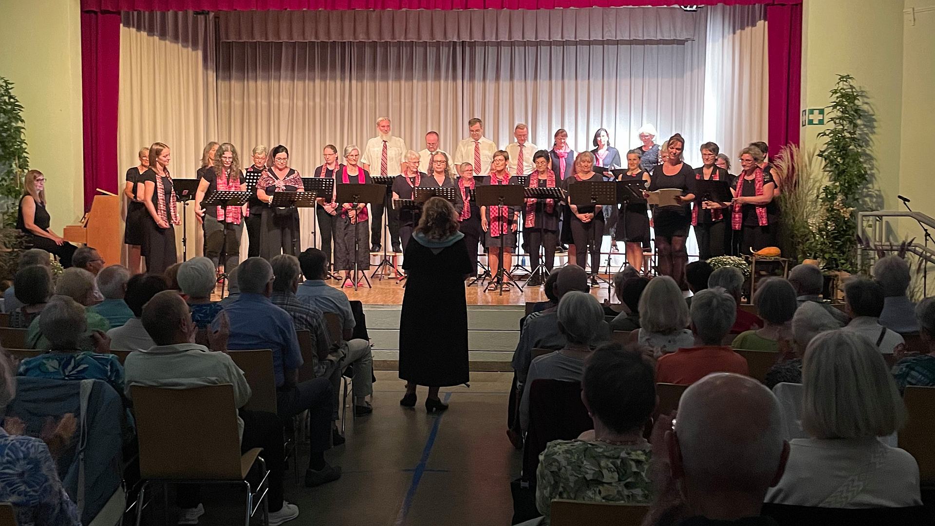 Am Samstag, 20.09.2025, folgte der zweite Teil des Projekts – diesmal in der in der wundervoll herbstlich geschmückten Festhalle Neuershausen, wo sich die Chöre einem begeisterten Publikum präsentierten. Von Beginn an ließen sich die Zuhörer mitreißen, spürten die Freude am Singen in jeder Note. Unter der Leitung von Gudula Gertzen und am Klavier von Olga Tomilov gefühlvoll begleitet, begeisterten die Choryfeen mit starker Präsenz.