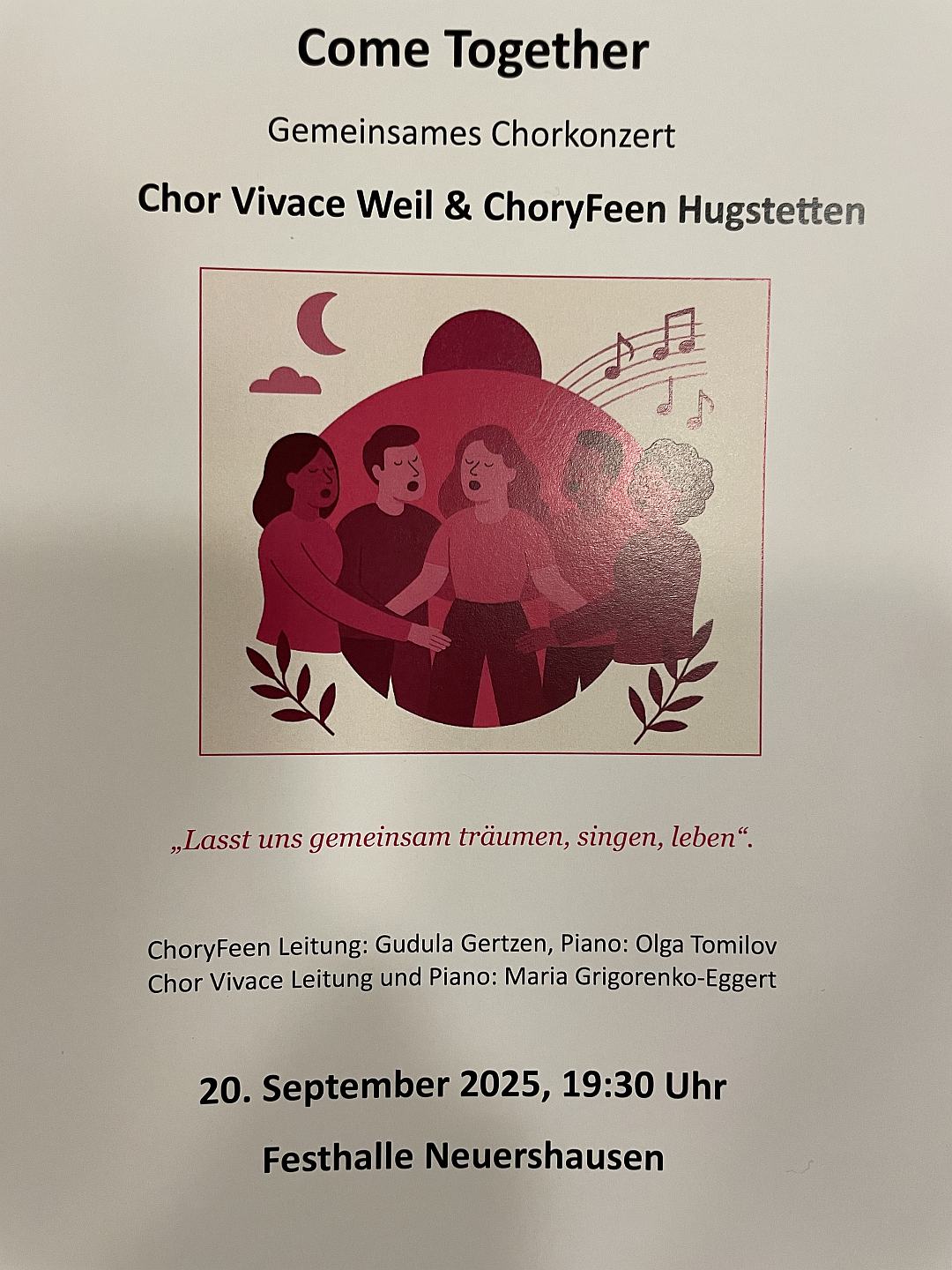 Mit dem Titel „Come Together“ luden die Choryfeen Hugstetten und der Chor Vivace Weil zu einem gemeinsamen Chorkonzert, das an zwei ganz unterschiedlichen Orten stattfand. Die Erfahrung, ein Programm in zwei so kontrastreichen Locations zu singen, war für die Sängerinnen der Choryfeen besonders eindrucksvoll. Unterschiedliche Akustiken, unterschiedliches Publikum – und doch ein gemeinsames Ziel: Menschen durch Musik zu verbinden.