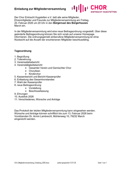 Der Gemischte Chor Eintracht Hugstetten e.V. lädt alle seine Mitglieder, Ehrenmitglieder und Freunde zur Mitgliederversammlung am Freitag,