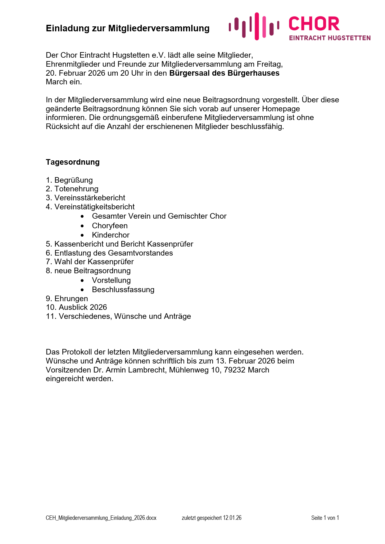 Wünsche und Anträge können schriftlich bis zum 13. Februar 2026 bei dem Vorsitzenden Dr. Armin Lambrecht, Mühlenweg 10, 79232 March eingereicht werden.